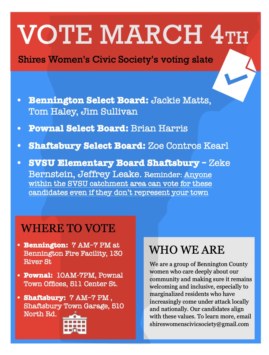 NOTE: The ballot drop box is NOT AVAILABLE on March 4; ballots must be brought to the polling place (see in person voting below). You may also mail it to us at PO Box 469, Bennington, VT 05201.